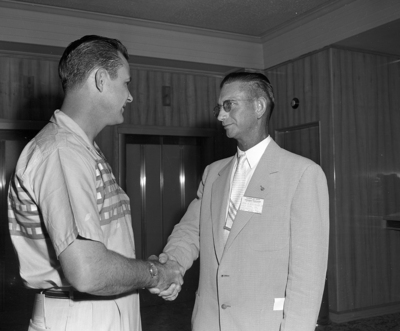 Dwight L. Lovett, left, American Trading & Production Corporation, Abilene, greets Leon McKkiney, Gulf Refining Company, Shreveport.