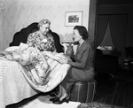 Image shows Mrs. W. G. Middleton, left, in bed and Hill County Home Demonstration Agent Velma H. Slaughter, right. Velma H. Slaughter is shown touching a comfort that Mrs. Middleton made. Published in the Fort Worth Star-Telegram morning edition, July 2, 1950.