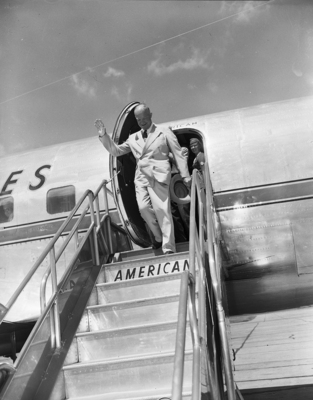 General Eisenhower disembarking his plane greeting a crowd of voters at Perrin AF Base on presidential campaign tour.