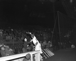 Fort Worth Cats' Dee Fondy goes into stands for catch of Indian Harry Malmberg's pop fly in seventh inning as unidentified La Grave Field spectator, eyes shut and hands closed, tries hard to get in on the play. Tribe won, 6-0.