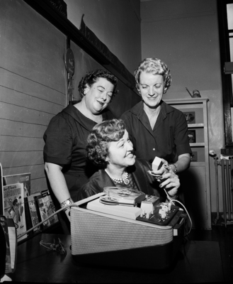 Miss Jo Kelly, director of special education, Fort Worth Public Schools, tests a tape recorder at West Van Zandt Elementary School. Standing are Miss Pauline Ritch, left, chapter president, and Miss Helen Gully, a teacher at the school.