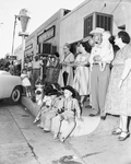 Series on the Possum Kingdom Roundup. Clinton Lowe, Benny Joe Lowe, Sue Hamer, and Jim Hamer. spectators at a parade. Visible behind them is a large ice cream statue in front of an ice cream shop.