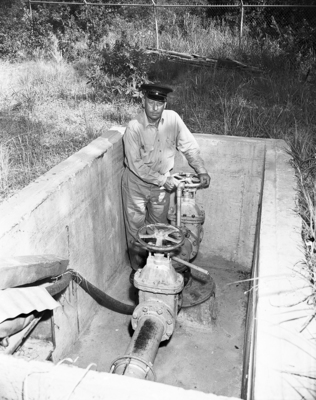 Westover Hills. Fred V. Barnett, assistant superintendent and operator of water works in Westover, turns valve on well.
