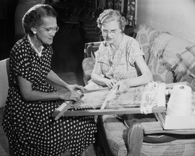 Mrs. E. F. Manchester, showing Mrs. A. A. Eckert how to weave.
