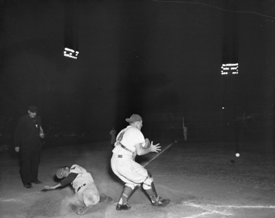 Phil Masi, Dallas catcher, slides home with a run in the fourth inning Thursday night at La Grave Field while Cat Catcher Ken Staples awaits the throw from the outfield. Masi is scoring from second on a single. Dallas won the game, 6-1, to end the Cats' winning streak at seven games.