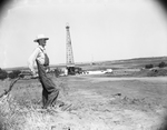 Grayson County. Farmer A. C. Hackworth looking over site where two oilwells have been drilled.