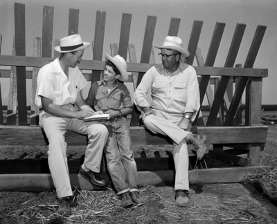 County Agent John Galloway, left, and Gary Snow discusses one of Gary's 4-H demonstrations. H. P. Meyer, right, who is Gary's uncle, is a Hood County adult 4-H leader.