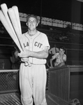 Joe Frazier of Oklahoma City, the Texas League's leading batsman through latest official averages, carries an armful of bats before going into action against the Cats at La Grave Saturday night. Fraier's mark through the official compilation period is.376.
