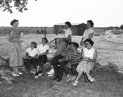 Time for a safety survey on the Gordon Reed farm in the Fairview community in Hood County finds members of the community 4-H Club ready to go to work. Here Club President Katie Liles explains use of safety hazard placards to club members, seated, left to right, Sherrie Reed, Martha Reed, Thurmond Peveler, Billy Berry, Ray Reed and Anne Atwood. Standing, Mrs. Reed and son, Danny, and Mrs. E. L. Atwood, adult club leader, look on.
