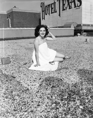 Singer, Miss Joyce Mayo, from New Orleans, is shown taking a sun bath, enjoying the "Lucky Old Sun" she would sometimes sing about. The band that Miss Mayo would sing with, was playing at the Hotel Texas Keystone Room during the time of this photo. Published in the evening edition, April 28, 1950.