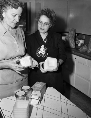 Mrs. Velma H. Slaughter, left, explains to Mrs., Ehrke some of the good points about the plastic type freezer containers. Mrs. Slaughter is Brown County home demonstration agent.