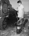 Don't try any repairs to combines while they're running. Bob Blakemon, John T. White 4-H Club member, made sure the engine was off before starting his grease job as pictured here.