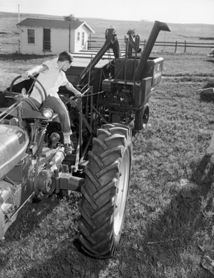 And disengage the clutch before starting your engine. Bob Blakemon of John T. White 4-H Club reaches for the clutch here as he gets the combine ready for a harvest operation.
