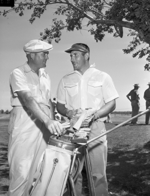 Ralston Brown, left, of Abilene looks over clubs of Vitamin T. Smith, Abilene golfer and star halfback for the professional Los Angeles Rams, during first-round matches Thursday in Abilene invitation golf tournament.
