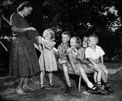Enjoying refreshments on a summer day are Mrs. G. H. Michalk, 1103 Samuels Avenue, and her children and niece, left to right, Judy and Roger Michalk; Diane Fredericks, neice of Mrs. Michalk, and Gordon and Henry Michalk. Mrs. Michalk and her husband recently returned from a trip to Houston.