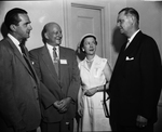 Greeting Navy Secretary Robert B. Anderson, right, at a University of Texas law class (1933) breakfast at Hotel Texas Friday were, left to right, Governor Shivers, Militon S. Simon of Fort Worth, permanent secretary of the class, and Mrs. Lee Kirkwood of Fort Worth, whose husband is a class member. The Navy secretary is in Fort Worth to speak to the State Bar of Texas Friday night.