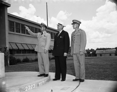 Commander J. R. McGonigle, left, commanding officer of the Naval Reserve Training Center here, points out facilities to Secretary of the Navy Anderson, who inspected the center. Looking on is Marine Captain D. W. Hielscher.