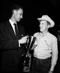 A. E. Betzel Jr., left, president of Arlington Junior Chamber of Commerce, presents a loving cup to V. F. Bunkley, president of the Arlington Saddle Club, for having the best mounted group in the Arlington Day parade.