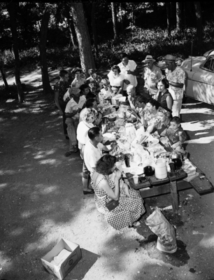 On the fourth of July, many families have a picnic. A group of relatives and in-laws of Mr. and Mrs. S. D. Helm, formerly of Keller and now of Selma, California, are having a picnic.