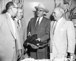 Republican Party leaders presented Texas cowboy boots to Secretary of the Army Robert Stevens at his visit here, which goes well with the Shady Oak hat gifted by Amon Carter. Left to right, Tarrant County Republican Chairman W. C. Conner, National COP committeeman Jack Porter of Houston, Secretary Stevens and State GOP chairman Alvin Lane of Dallas.