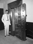 Stephenville State Bank opened for its first day of business in a new building. The new buildings's featured is a 48-ton air-conditioner. The structure 52 ft wide and 104 feet long includes a community room for club meetings, a kitchen and coffee room. The bank occupies the first floor of a two-story building cost of $135,000. C. H. Maguire Jr., vice president and cashier, inspects a massive portal to the new bank building's vault.