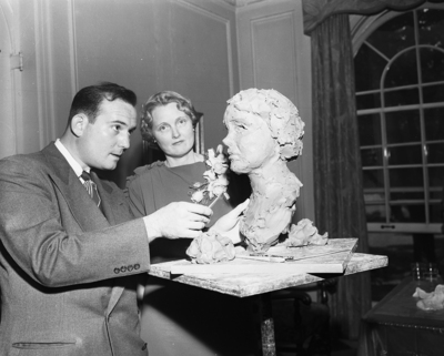 Mr. Leonard M. Logan III, of the Texas Christian University (TCU) art department, is shown standing next to Mrs. B. D. Monk, the Women's Club Art Department chairman, as he uses her as a model for a lecture-demonstration on "Terra Cotta Portrate making". Published in the evening edition, May 2, 1950.