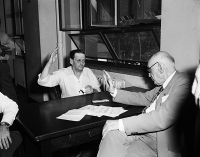 Leslie Ben Drake of Dallas, accused of burglarizing the First National Bank of Trenton on June 8, with a temporary hearing with U. S. Commissioner Milam. Drake claims no knowledge about the bank burglary. Milam set the temporary bond and agreed to arraign Drake at 2 pm. at the U. S. Courthouse.
