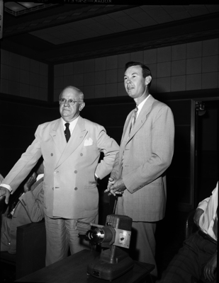 Mayor Edgar Deen, left, is shown discussing with Lee Cox of a firm of weather scientists the proposal that Fort Worth seed clouds hereabouts in an effort to increase rainfall.