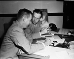 Gordon Teague, left, and Charles Stall plan the 1954 chapter plan division booklet of United Fund., which will be the first major literature to go out from the fund-raising group this year. Teague is in charge of literature for the division. Stall is a co-chairman of the information committee.