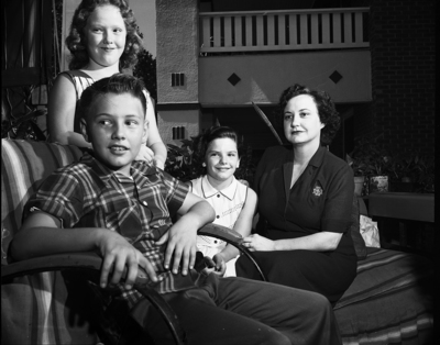 Visitors in the home of Mrs. G. F. McDonald, 2005 Hemphill, are her grandchildren, Penny, standing, and Arthur Mancille Jr. seated left; Betty Wheeler of Oklahoma City, center; and her daughter, Mrs. A. R. Mancille, right. The Mancilles live in Aspermont.