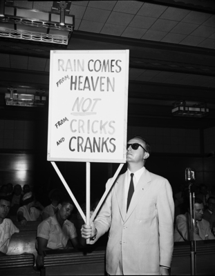 O. T. Hampton, publicity man, told City Council cloud seeding is an "abortion of natural law". He holds a poster that reads "Rain comes from heaven, not from cricks and cranks." Hampton's placard refers to Dr. Irving Krick, Denver meteorologist and head of the cloud seeding firm the council is considering hiring.