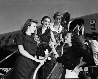 Miss Alabama, Doris Edwards of Birmingham, greets, left to right up ramp, Miss Virginia, Dot Bailey of Norfolk; Miss North Carolina, Libby Walker of Raleigh, and Miss Maryland, Diane Durham of Silver Spring. The girls are constants in the Miss Universe contest at Long Beach, California, this week. They stopped briefly at Carter Field Thursday afternoon.