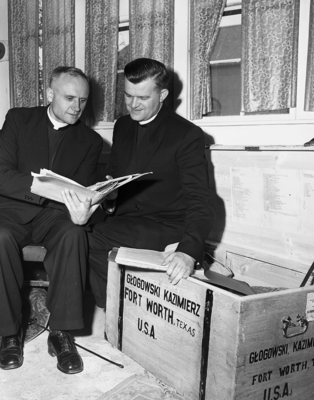 Reverends M. J. Dabrowski, left, and Kazimierz Glogowski, are shown reviewing notes on their lives and liberation at Dachau concentration camp during the Holocaust April 29, 1945, which they planned to put into written form. Published in the evening edition, April 28, 1950.