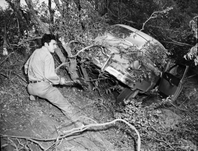M. J. Morgan hacks at trees in scrub oak thicket to free the car of Mrs. Donald A. Lawrence, which was sideswiped off the 3500 block of South Riverside Drive and plunged into the wooded area. Mrs. Lawrence died and her two small children were injured.