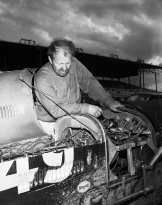Mr. Fletcher Pierce, a Hollywood Stunt driver, is shown inspecting his Wayne Special, which had developed supercharger trouble the evening before a big car race at Arlington Downs. Published in the evening edition, April 28, 1950.