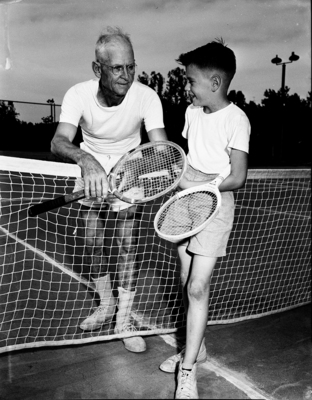 There'll be three age divisions and two classes - open and novice in the playground tennis tournament at Forest Park for a three-day run. O. E. Thomas, 71, of Grapevine gives Mike Hickey, 9 a few pointers in tennis. Thomas will enter the veterans class city tennis tournament while Mike will compete in the playground tournament.