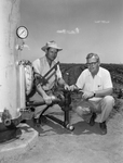 Dell Wade of Houston, left, engineer for Crown Central Petroleum Corporation, and B. H. Britt of Houston, division superintendent, at Number 1 R. E. Broz, Ellenburger discovery east of San Angelo in Tom Green County.