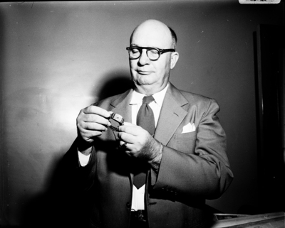 Joe B. Cooper with wristwatch. Clipping reads: "Joe B. Cooper of 5507 Collinwood has been presented a wrist watch for completing 25 years' service with General Motors Acceptance Corporation (GMAC). A. M. Casey, regional manager of Dallas, made the award. Cooper, who moved here in 1934 and spent three years as manager of the Wichita Falls district, is manager of the Fort Worth branch of GMAC." Published in the Fort Worth Star-Telegram evening edition, July 11, 1953.