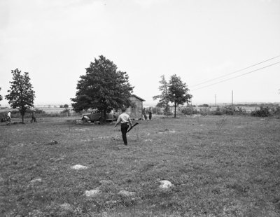 Image shows officers surrounding a small chicken house where fugitive Lawrence Byrom was believed to be hiding. Neighbors had said that Byrom was spotted at dusk near the house, seven miles south of Boyd Texas, however, officers found nothing in the house but several dozen chickens. Published in the evening edition, April 28, 1950.