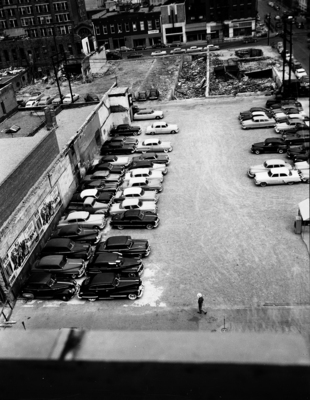 A parking lot already has replaced the spot in Waco where a tornado ripped down the five-story R. T. Dennis Building May 11. Damage still can be seen in the background.