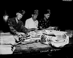 Clipping reads: "They're Convention Bound: Moslah Shrine members crowded Santa Fe Station Saturday [July 11, 1953] night before they entrained for the Shrine convention in New York City. Pictured here, Shriners bundle Star-Telegrams to be delivered to delegates aboard the train. Left to right are Roy Thompson, Johnny Bevil, and Gene Fielder." Published in the Fort Worth Star-Telegram, July 12, 1953.