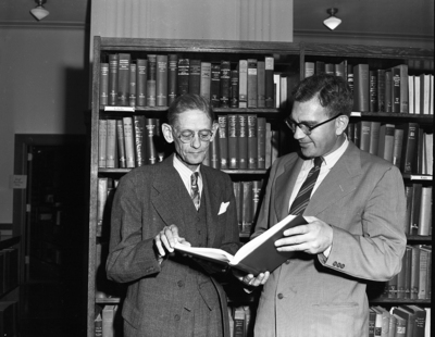 Harry Gould, manager of the Palace Theater (left), is shown presenting a gift research handbook from Cecil B. DeMille to Librarian J. S. Ibbotson. The history book deals with the lives and customs of people during the time of "Samson and Delilah", a movie that would soon be showing at the theater. Published in the evening edition, April 28, 1950.