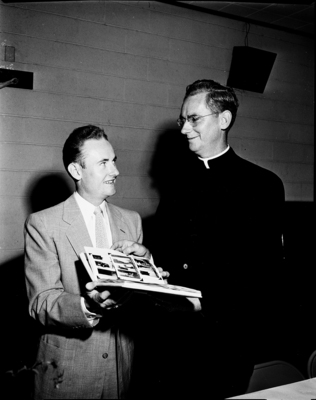 Photographs of events while Reverend Herbert Vogelpohl, O. S. B., right, was director of the citywide Senior Catholic Youth Organization are reviewed by the departing priest and Walter Paquette, left. The album was presented to Father Vogelpohl at a breakfast in his honor.
