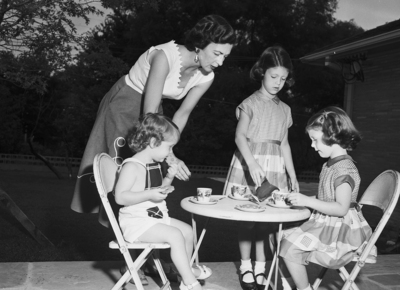 Mrs. John L. Lewis and daughters, Elinda, Rusty and Marilyn, having a little tea party with just themselves.