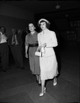 Mrs. Helen Grubbs Mecke, right, 19- year-old mother, was sentence Monday to serve five years for the robberies of the North Fort Worth State Bank and the First National Bank of Handley. Nicknamed "Piano Legs", she is shown here with Mrs. Verna Ditto, deputy U.S. marshal, preparing to enter United States District Courtroom.