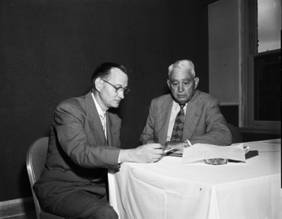 Paul Phillips, left, of Dallas, of the food distribution branch of Production and Marketing Administration for the U. S. Department of Agriculture, and Robert M. Fielder of Abilene, a West Texas Chamber of Commerce committeeman, draw up plans for a campaign to sell the surplus supply of low-grade beef in Texas. A united campaign to boost the sale of lo-grade beef on consumer and retail levels will be staged during August and September on a state, regional and local level.