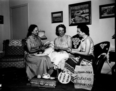 Misses Vera Tuberville, 3124 Westcliff Road West, Charlotte Grove, 2020 Carleton, and Virginia Hulse, 1207 Clara, pictured left to right, examine souvenirs from their recent Carribean cruise, which took in such places as Venezuela, Jamaica, Trinidad and Curacao.