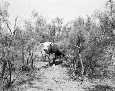 This registered Hereford bull is an important factor in the Coleman County livestock program carried on by Corky Chapman, candidate for the FFA Star American Farmer award this year. Shown is a bull surrounded by bushes.