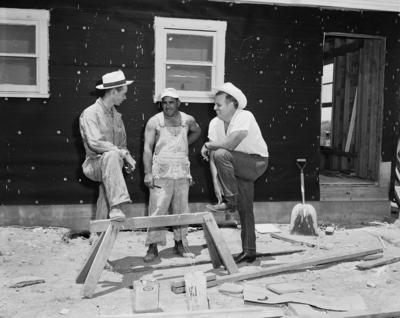 Corky Chapman, 19-year-old Coleman County farmer, left, talks with Henry Guirtez, contractor working on a new farm home for Chapman and his mother. At right is Jake Joyce, Coleman vocational agriculture teacher.