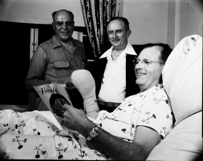 Members of South Side Lions Club met especially Wednesday night in the hospital room of Willard Jones of Hamlin, right, who has a perfect eight-year club attendance record. Conducting the meeting were L. C. Hartwig, left, past president, and C. O. Patterson, president, Jones is in Saint Joseph's Hospital after losing most of his right hand in an accident.
